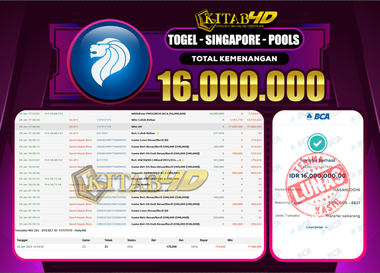Togel online adalah salah satu game favorit yang tersedia di situs kitab4d yang dapat di maikan semua kalangan dari remaja hingga dewasa. Berikut adalah bukti pembayaran kemenangan salah satu pemain setia situs kitab4d di permainan togel SINGAPORE POOLS sebesar Rp 16.000.000,- dan sudah kami bayar secara lunas.
