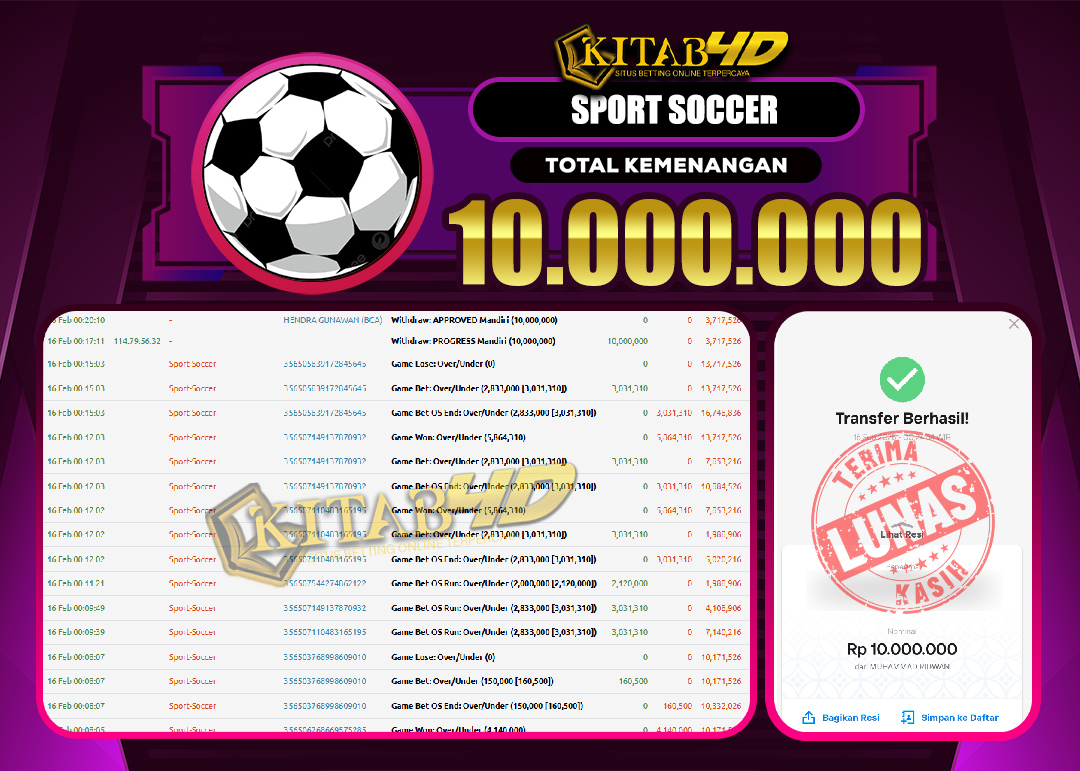 SPORTBOOKS adalah salah satu game favorit yang tersedia di situs kitab4d yang dapat di maikan semua kalangan dari remaja hingga dewasa. Berikut adalah bukti pembayaran kemenangan salah satu pemain setia situs kitab4d di permainan SPORTBOOKS sebesar Rp 10.000.000,- dan sudah kami bayar secara lunas.