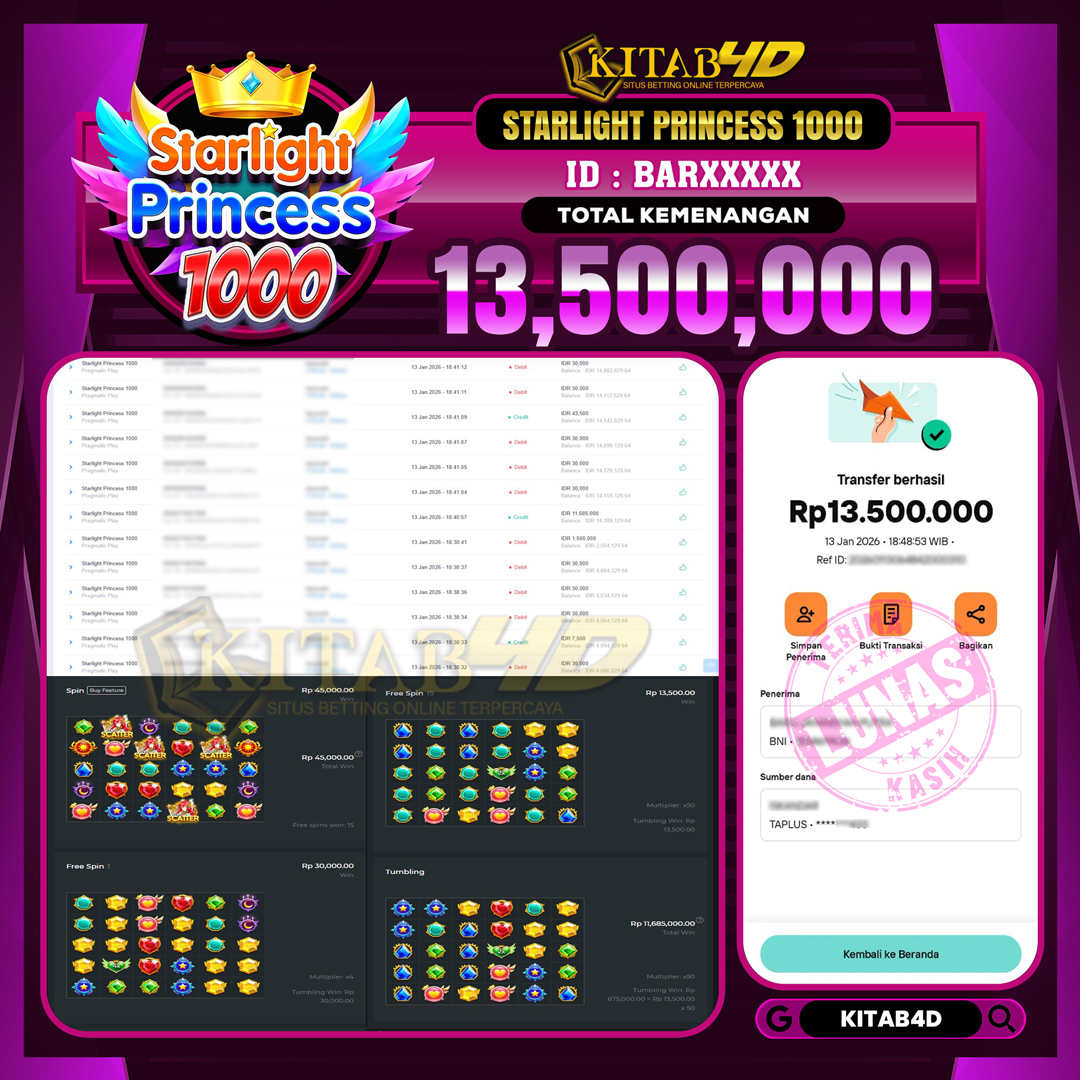 Kami mengucapkan selamat kepada pemain setia situs kitab4d yang sudah memenangkan hadiah sebesar Rp 13.500.000 dalam permainan JACKPOT SLOT STARLIGHT PRINCESS 1000 pada 13 JANUARI 2026 dan sudah kami bayar LUNAS ke rekening yang terdaftar.