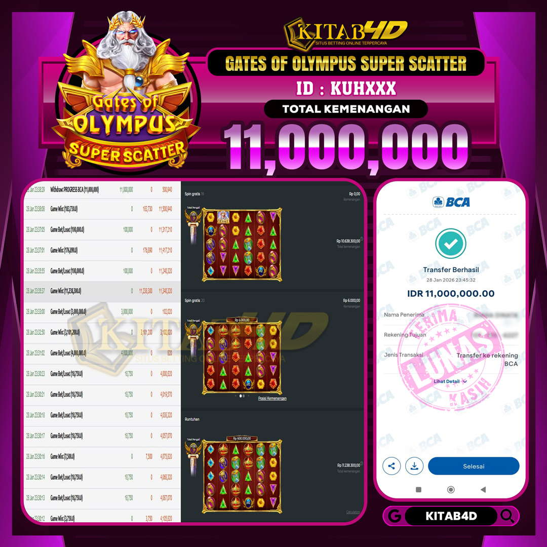 Kami mengucapkan selamat kepada pemain setia situs kitab4d yang sudah memenangkan hadiah sebesar Rp 11.000.000 dalam permainan JACKPOT SLOT GATES OF OLYMPUS SUPER SCATTER pada 28 JANUARI 2026 dan sudah kami bayar LUNAS ke rekening yang terdaftar.