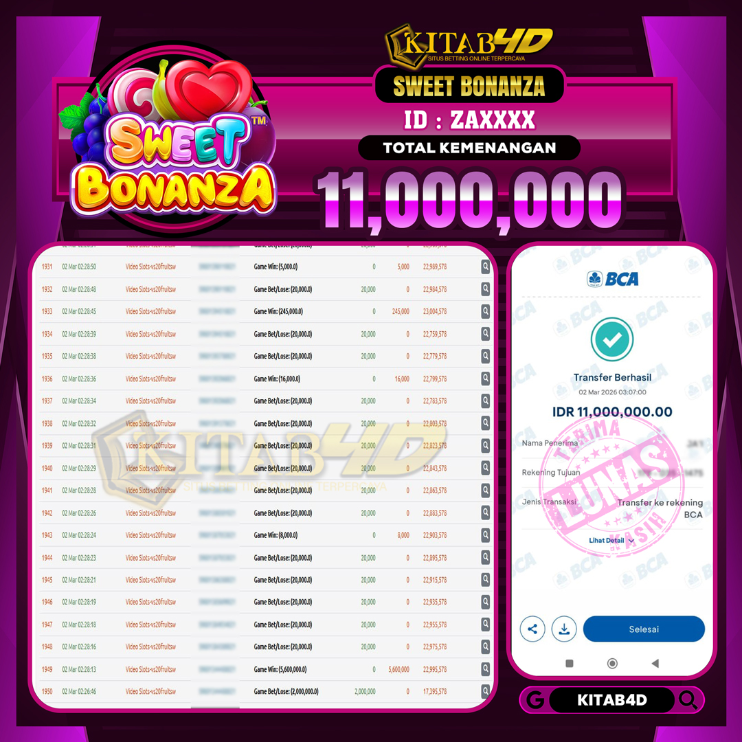 Kami mengucapkan selamat kepada pemain setia situs kitab4d yang sudah memenangkan hadiah sebesar Rp 11,000,000 dalam permainan JACKPOT SLOT SWEET BONANZA pada 02 MARET 2026 dan sudah kami bayar LUNAS ke rekening yang terdaftar.
