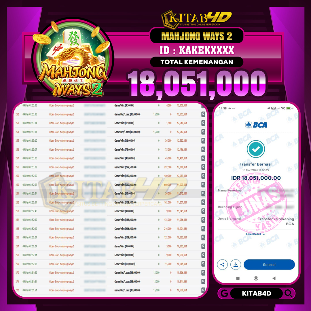 Kami mengucapkan selamat kepada pemain setia situs kitab4d yang sudah memenangkan hadiah sebesar Rp 18,051,000 dalam permainan JACKPOT SLOT MAHJONG WAYS pada 15 MARET 2026 dan sudah kami bayar LUNAS ke rekening yang terdaftar.