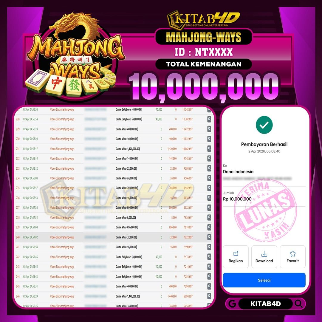 Kami mengucapkan selamat kepada pemain setia situs kitab4d yang sudah memenangkan hadiah sebesar Rp 10,000,000 dalam permainan JACKPOT MAHJONG WAYS pada 02 APRIL 2026 dan sudah kami bayar LUNAS ke rekening yang terdaftar.