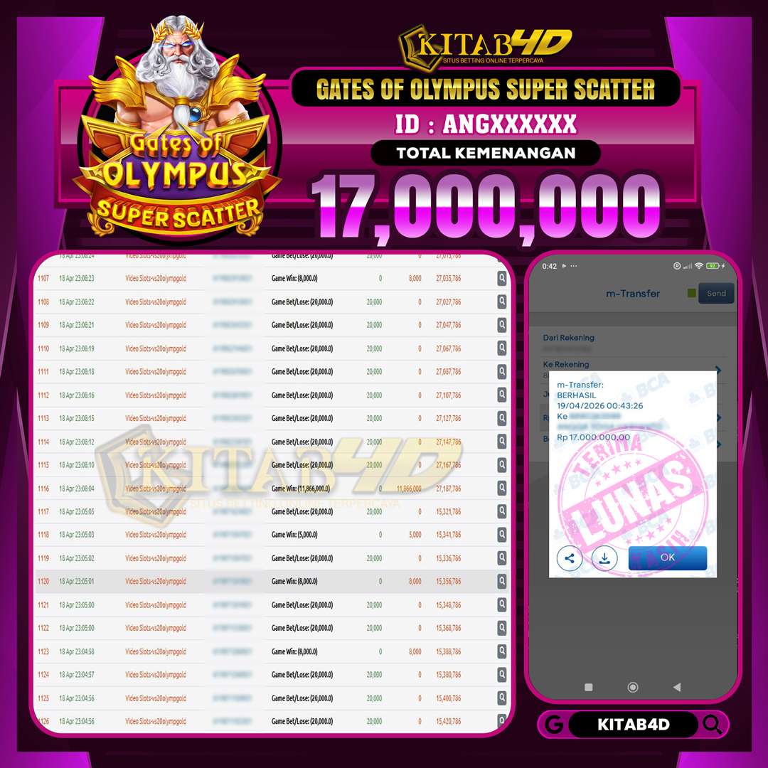 Kami mengucapkan selamat kepada pemain setia situs kitab4d yang sudah memenangkan hadiah sebesar Rp 17,000,000 dalam permainan JACKPOT GATES OF OLYMPUS SUPER SCATTER pada 19 APRIL 2026 dan sudah kami bayar LUNAS ke rekening yang terdaftar.